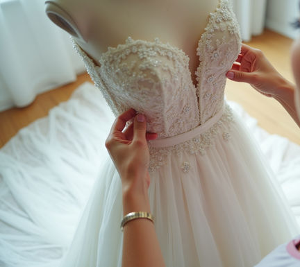 For brides outside the Tampa/St. Pete area, we offer a made-to-measure remote design option. Once your measurements and fabric, lace, or beading selections are received, we draft your custom pattern, source materials, and create your gown with the same couture construction used for in-studio clients. Your finished gown will be shipped to you, and final alterations will be completed by a trusted local seamstress in your area to ensure the perfect fit. This option allows brides nationwide to enjoy our custom design experience while completing the last fit stages close to home.